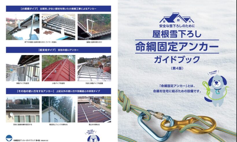 令和3年度は克雪すまいづくり支援事業と合わせて6,080万円程度の予算確保。そして、創設年度の令和3年度は110戸で設置され、令和4年度161戸、令和5年度181戸、令和6年度237戸と年々着実に普及し令和6年度末で累計689戸が設置されたことになる。それでも2024年には上記のような被害状況に達しているわけで、県のさらなる発信力強化が求められるところだ。令和7年度9月末現在の実績は110件で443万円の執行となっている。また事業に伴い「屋根雪下ろし 命綱固定アンカー ガイドブック」が作成され、改訂を重ねて昨年には第4版まで刊行されている。