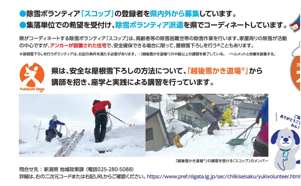市村県議は「命綱をつけて除雪作業をするには、それを固定する『命綱固定アンカー』が必要になります。県では除雪ボランティア『スコップ』を組織し、高齢者世帯などに派遣されていますが、彼らも命綱固定アンカーがなければ作業ができない決まりになっています。県では屋根雪対策条例を定めて命綱固定アンカーの普及を呼び掛けていますが、あくまで努力目標に過ぎません。この命綱アンカーですが、令和元年時点の確認では見た目にこだわらなければ単管を配した簡単なつくりで、工事費としてだいたい12万円程度。材料費も入れると20万円ほどだと思います。県では令和3年(2021年)に『命綱固定アンカー普及促進事業』が始まるまで、設置に対して補助金などの支援は行っていませんでした」と話す。