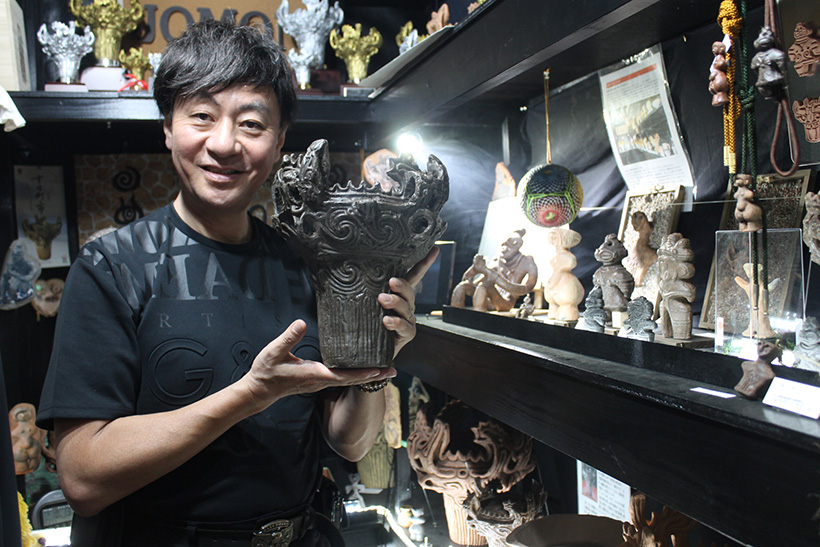 新作の酒器は、縄文文化への関心が高まる中で「火焔型土器の造形を日常的に使える器として生かしたい」との思いから企画。新潟県内で製造された。火焔型土器特有の突起が並ぶ原型は不安定な形状だが、国宝の出土資料を参考に意匠を再現するよう努めつつ、実用的な形に調整した。