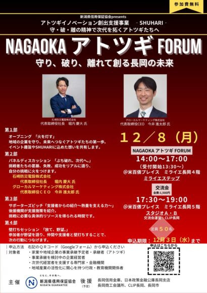 新潟県信用保証協会(新潟市中央区)は12月8日、事業承継予定者やアトツギ(承継者)が学び交流するイベント「NAGAOKAアトツギFORUM」を長岡市で開催する。同協会がアトツギ支援を目的としたイベントを主催するのは今回が初めて。地域企業の事業承継を後押しし、地方経済の活性化につなげる狙いがある。