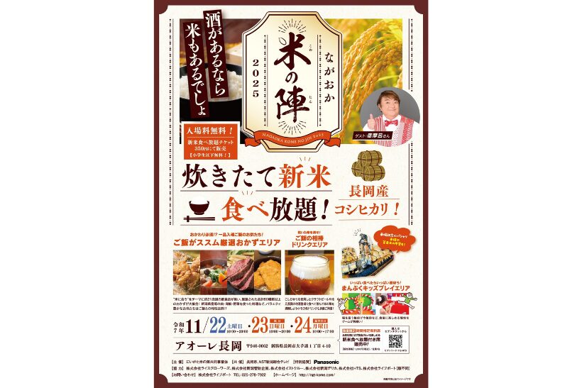 11月22日から24日の3日間、アオーレ長岡(新潟県長岡市)で「ながおか米の陣2025」が開催される。入場は無料。開催時間は22日、23日が10時から20時、24日は10時から17時で、主催は「にいがた米の陣共同事業体」。
