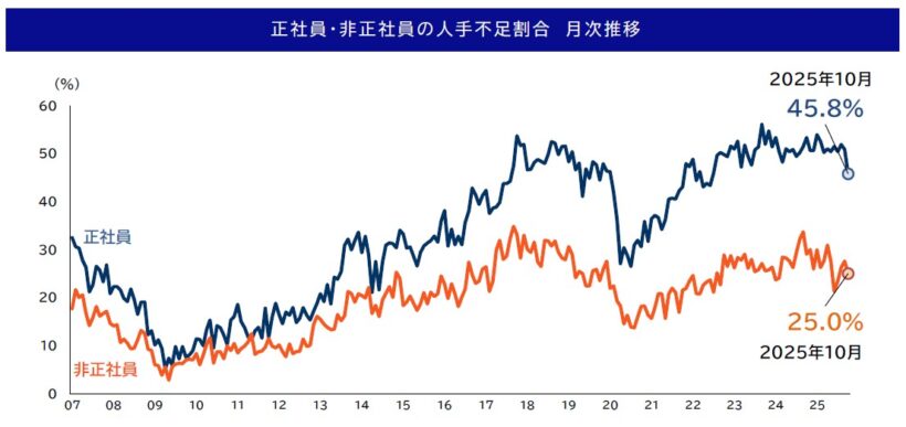 帝国データバンク新潟支店は11月26日、新潟県内企業を対象に実施した「人手不足」に関する動向調査(2025年10月)の結果を公表した。同月時点で正社員が不足していると回答した企業は45.8%、非正社員では25.0%となった。