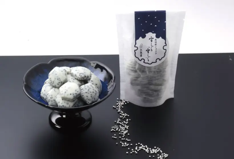 雪国新潟の冬の景色をホワイトチョコと黒胡麻(白と黒)で表現したチョコレート菓子。濃厚なホワイトチョコと香ばしい胡麻のハーモニーが楽しめる。焙煎した胡麻の香ばしさが引き立つ味わい。