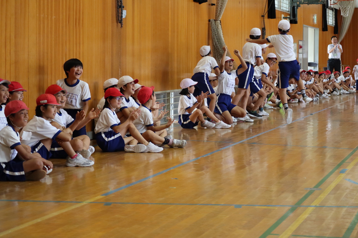 5、6年生の児童たちは、選手20名とコーチ陣8名を拍手で迎え、万代太鼓でおもてなし。選手たちのリフティングが披露されると、世界レベルの足技に目を輝かせた。その後、選手3人対児童6~8人の交代制でサッカーの対戦が行われ、児童たちは元気よく体育館を走り回り、メキシコ側のゴールポストに向かって果敢に攻めていた。