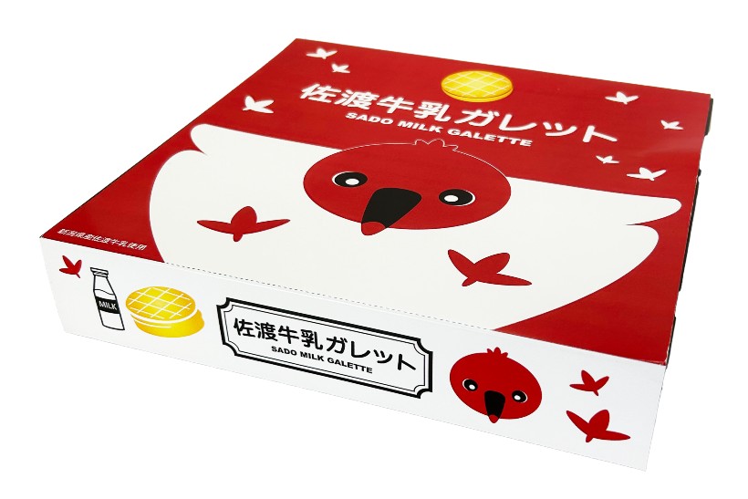 同製品は、佐渡牛乳を練りこんだ厚焼きガレットにホワイトチョコを入れ、専用の鉄板でサクサクに焼き上げたチョコ入りガレット。パッケージデザインは、トキが羽ばたくデザインでおなじみの「佐渡牛乳」のデザインをベースにした。