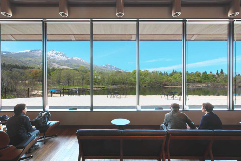 新装した妙高高原ビジターセンターの大型窓ガラスから臨む妙高山