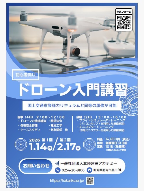一般社団法人北陸建設アカデミー(新潟県胎内市)は、ドローン入門講習、除雪オペレーター基礎講習、外国人材コミュニケーションセミナーの3種類の講習会を開催する。初心者の学習や企業の研修ニーズに対応した内容で、受講者を募集している。