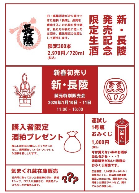葵酒造(新潟県長岡市)は2026年1月10日と11日の2日間、敷地内の「汲古庵(きゅうこあん)」で、新春初売り「新・長陵 蔵元特別販売会」を開催する。同社としての蔵元販売会は初開催だ。