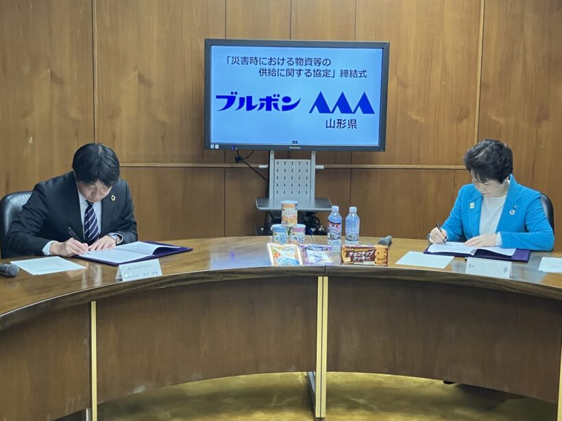 株式会社ブルボン(新潟県柏崎市)と山形県は12月18日、災害時における物資等の供給に関する協定を締結した。大規模災害発生時、または発生の恐れがある際、ブルボンは山形県の要請に基づいて飲料水や食料品を供給し、被災者の生活支援を図る。