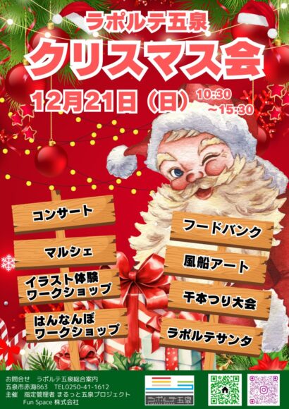 ラポルテ五泉(新潟県五泉市)で12月21日、クリスマス会が開催される。会場にはハンドメイド作品などのマルシェやキッチンカーが出店。クリスマスコンサートも開催される。クリスマス会は10時30分からスタート。クリスマスマルシェには、ハンドメイド品・雑貨、美容・健康・占い関連、ワークショップの計22店が出店。