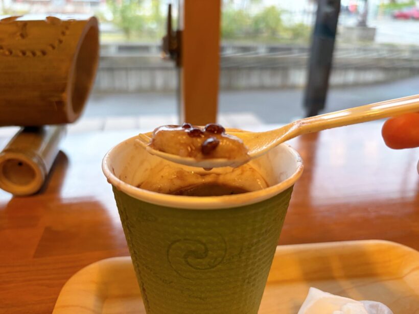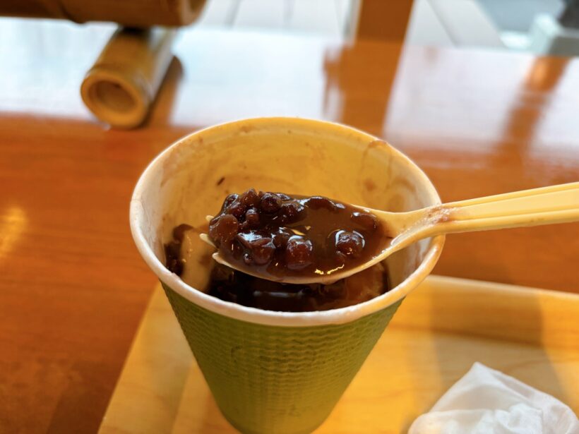 カップを受け取ると、熱々のおしるこの海に、名物の白いパンダがぷかぷかと浸かっている。そのなんとも言えない愛らしい姿に、思わず頬が緩み、優しい気持ちに包まれる。