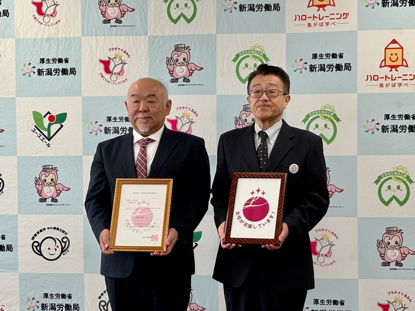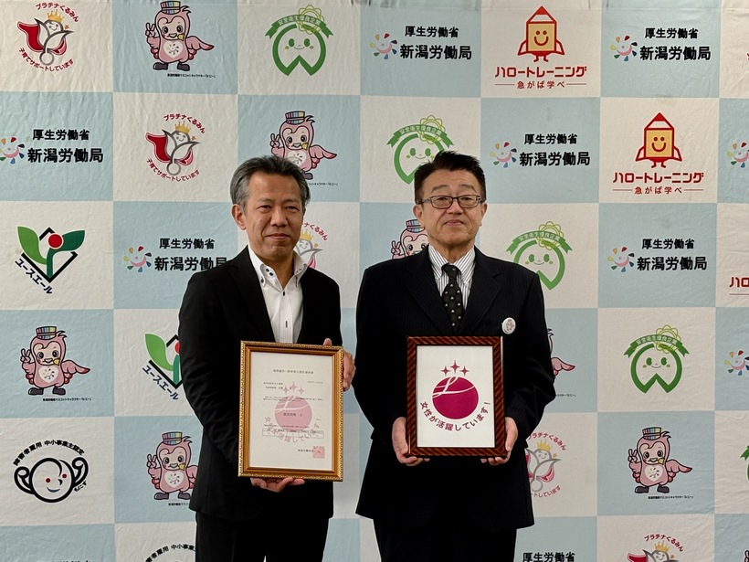 厚生労働省新潟労働局はこのほど、新潟県労働金庫 (新潟市中央区)と小片鉄工株式会社(新潟県小千谷市)の2社を「子育てサポート企業」として「くるみん」企業に認定した。また、株式会社佐文工業所 (新潟市江南区)、プライムテック株式会社(新潟市中央区)、北陸電々株式会社(新潟市中央区)、グリーソンサイクニ株式会社(新潟市江南区)の4社を女性活躍の取り組みに力を入れる「えるぼし」企業に認定した。