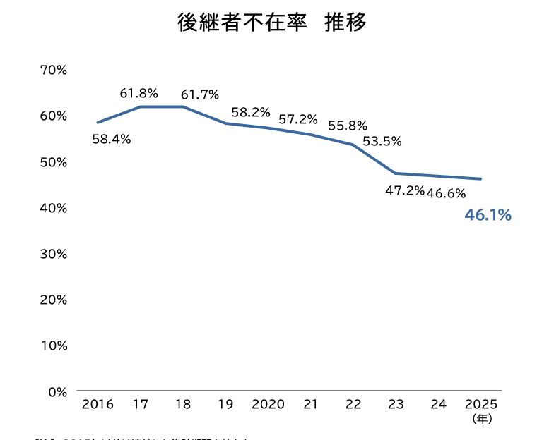 帝国データバンク新潟支店(新潟市中央区)は12月23日、新潟県内企業の「後継者不在率」動向調査(2025年)の結果を発表した。県内企業の後継者不在率は46.1パーセントとなり、前年から0.5ポイント低下した。低下は8年連続で、調査を開始した2016年以降で最低となった。