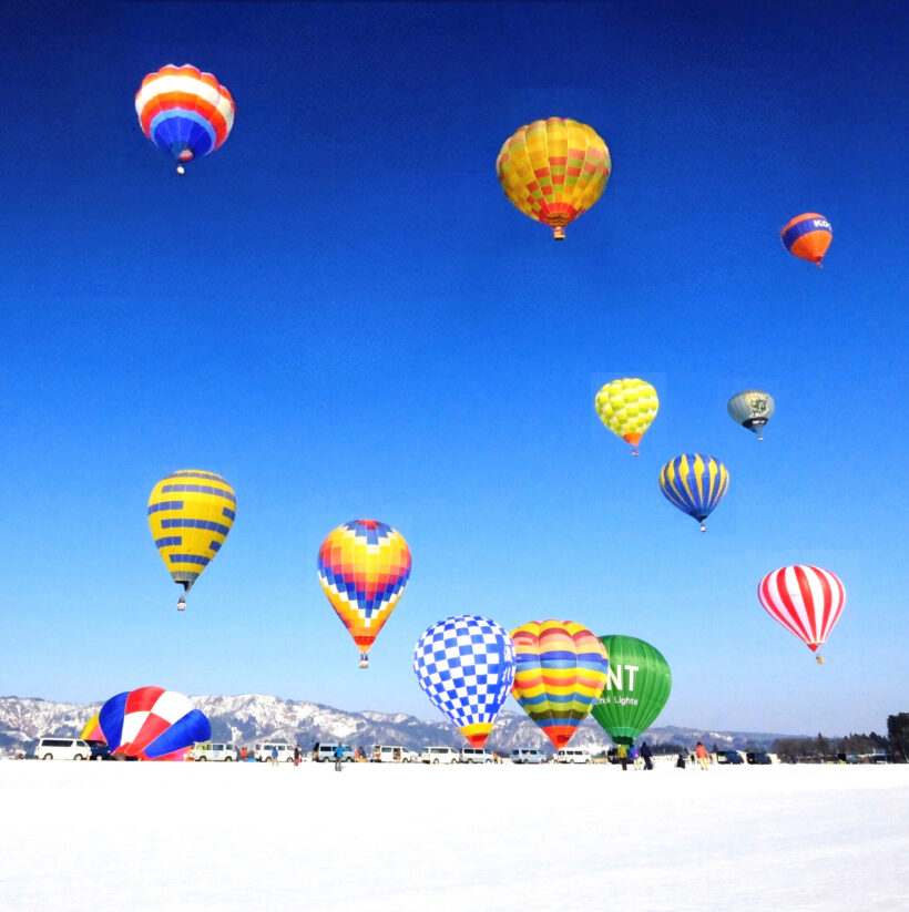 イベントは2会場に分かれ、西中会場(小千谷市大字西中)では、日本を代表する熱気球競技大会「日本海カップ・クロスカントリー選手権」を実施。平沢会場(小千谷市平沢新田111)では、熱気球の試乗体験(事前予約制)のほか、雪原イベントや飲食ブースが並ぶ「うまいもの広場」を開設する。夜には、熱気球と花火による光の演出「グローバルーンフェスティバル」を実施する予定だ。