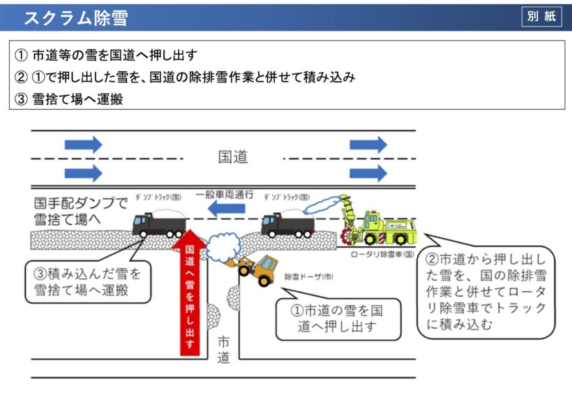 スクラム除雪は、大雪時に市道などの雪を隣接する直轄国道などに押し出し、一斉に運搬、排雪すること。
