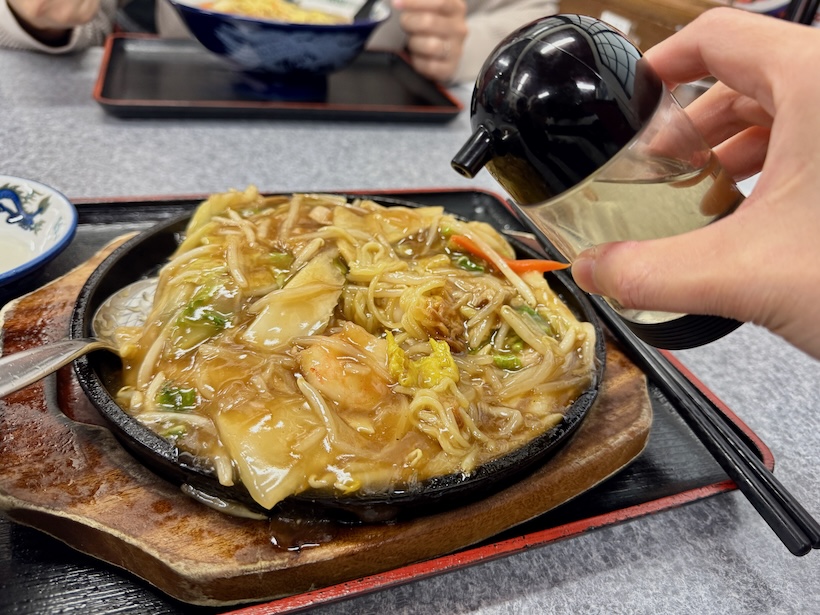 まずは作り手へのリスペクトを込めて、そのままとろりとしたあんにたっぷり麺を絡めて一口。「うん、うまい」熱が体に伝わるのを実感する。