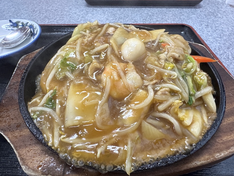目移りするほどさまざまなメニューの中から選んだ品は「鉄板五目焼そば」だ。グツグツと音を立てながら、鉄板の上を彩るあんかけ。流行には疎いキシャだが、あえて言わせてもらおう。