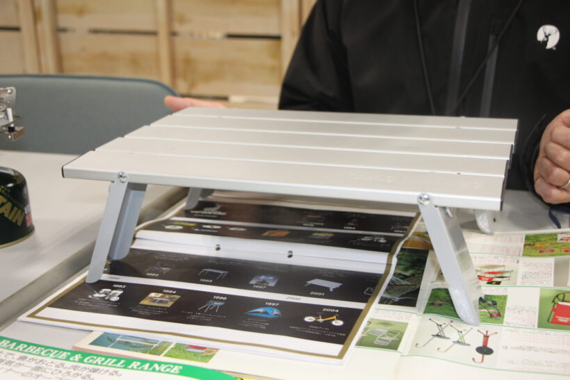 もう一つ、ブランドの転機になった忘れてはならない製品がある。それは2001年に商品化された「アルミローテーブル コンパクト」だ。軽量かつコンパクト設計でトレッキングやツーリングなど多様なシーンで重宝されるため爆発的にヒットした小型ローテーブルだが、実に計算しつくされた構造で、その使い勝手を生み出した。キャプテンスタッグが誇るプロダクトデザインチームが知恵を出し合い、軽量化とコストダウン、さらに強度など基本性能を実現した、まさに「逸品」。これ以降、「製造コストを削りながら機能は高めていく」というキャプテンスタッグ製品のブランドポリシーが強調された感がある。
