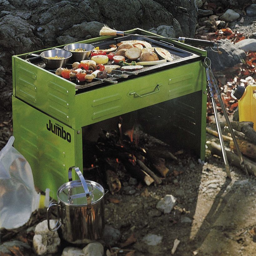 パール金属が1976年に製造販売した国産第一号バーベキューコンロ「ジャンボ バーベキューコンロA型」。トランク型になっており、持ち運びに便利な構造になっている