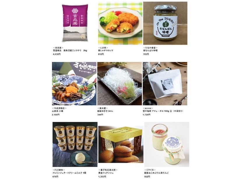 魚沼でも特に食味評価の高い「吉兆楽の雪温精法 南魚沼産こしひかり」をはじめ、南魚沼の伝統野菜「かぐらなんばん」を使用した「たなか食堂の青なんばん味噌」、魚沼の名水や米、稲わらで育てた牛のミルクを使用した「FLEMINのフレミンジェラートクリームミルク」などが並ぶ。主食からスイーツまで多彩な商品が集結。