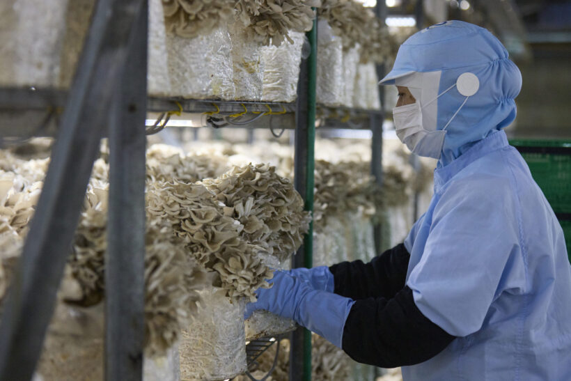 ユキグニファクトリー・バイオセンターにおけるまいたけの収穫。自社の菌株開発で計画生産が実現した