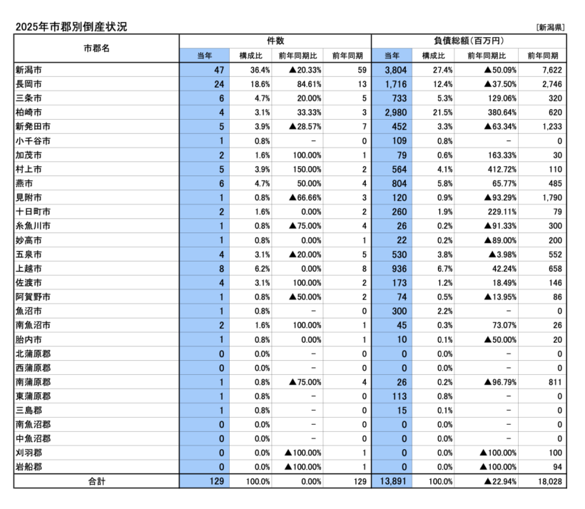 2025年新潟県市郡別倒産状況(ニュースリリースより)