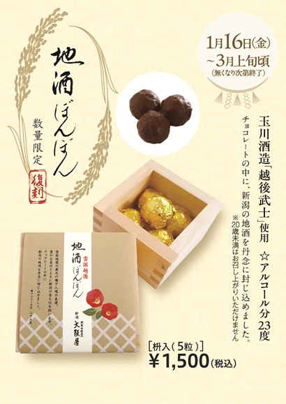 株式会社大阪屋(新潟市江南区)は1月16日から、玉川酒造株式会社(新潟県魚沼市)が製造する日本酒「越後武士(えちござむらい)」を使用した「地酒ぼんぼん」を数量限定で復刻発売する。同商品は2003年から2013年ごろまで冬季限定で販売されていた。