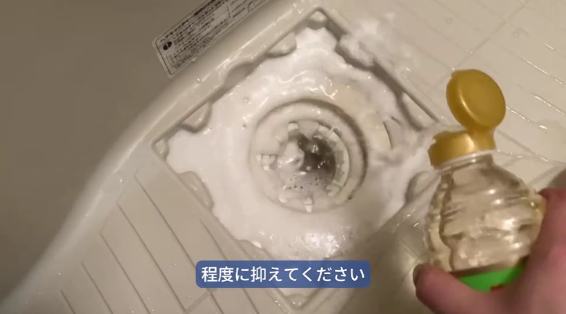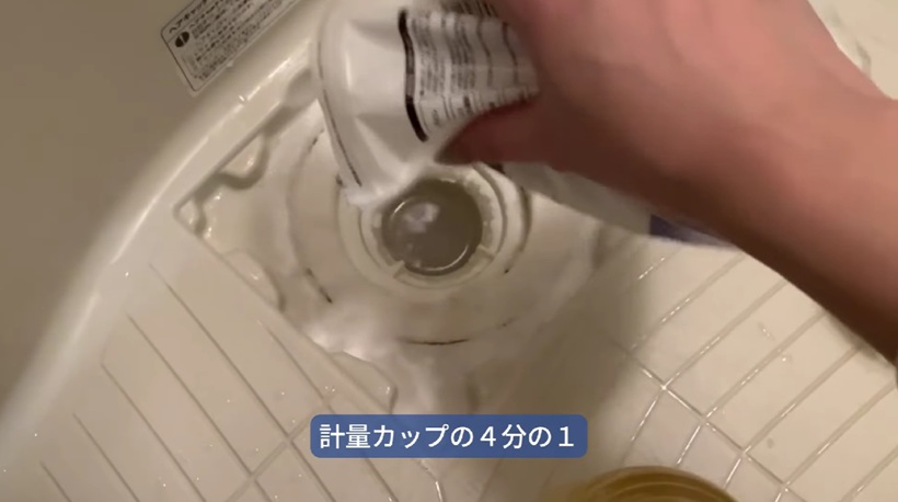 まずは、重曹を排水溝に振りかけます。この時使用する重曹の量は多くても計量カップの1/4程度までにしてください。振りかけたら排水溝に酢をかけます。酢は計量カップ1/2程度に抑えてください。