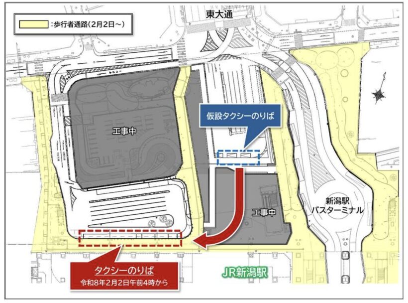 【2月2日から】新潟駅万代広場タクシーのりばが供用開始へ 2026-01-17 6日前 下越 行政 (新潟市役所報道発表資料より) 新潟市都市政策部によると、新潟駅万代広場の「タクシーのりば」の完成に伴い、2月2日4時から供用を開始する。 なお、豪雪などの悪天候により順延する場合があるが、これにより「仮設タクシーのりば」は廃止される。