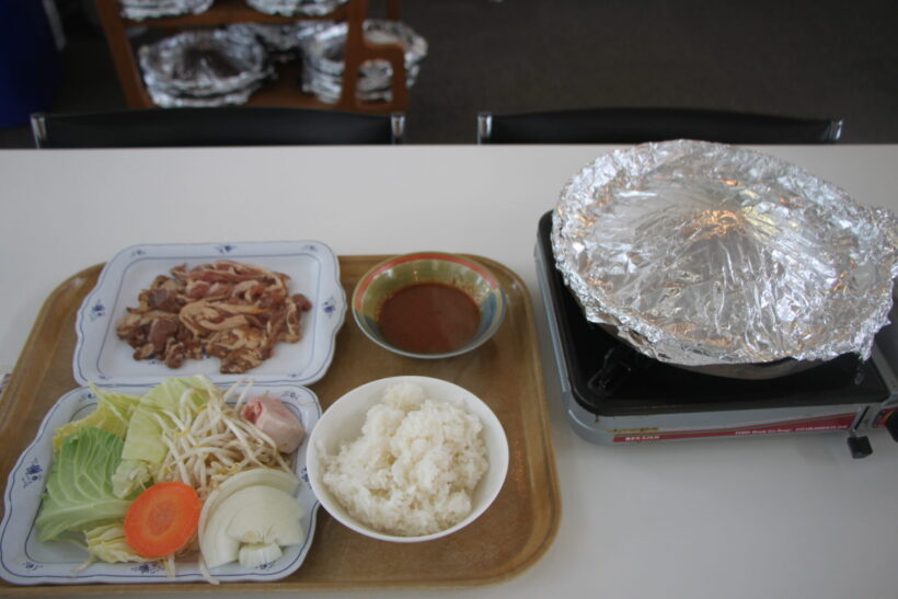 受付ブースでジンギスカン(税込1,600円)とごはん(税込300円)の食券を購入。カフェテリア方式の厨房に食券を出す。厨房ではベテランの男女各1名が調理や配膳に当たっている。