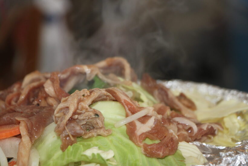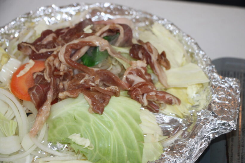 このように野菜の上に肉を載せるのが本場のジンギスカンの食べ方