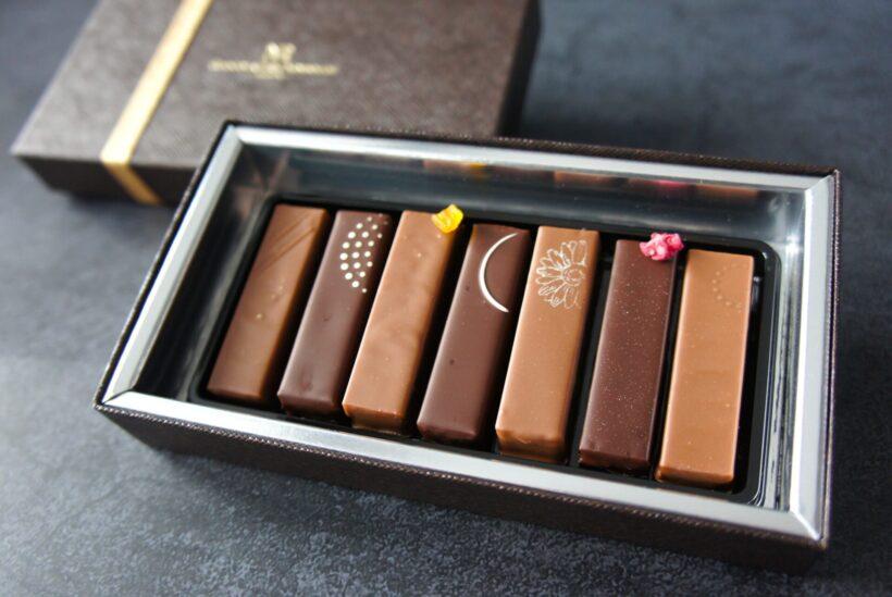 目玉となるのは、7種のフルーツを使ったボンボンショコラの詰め合わせ「ショコラアソート“フリュイ”」。レモンやオレンジ、カシス、洋梨、アプリコット、林檎、ラズベリーを用い、それぞれの果実の個性とチョコレートのバランスを重視して仕上げた。細長いスティック状のフォルムも特徴で、味わいだけでなく見た目にも工夫を凝らしている。