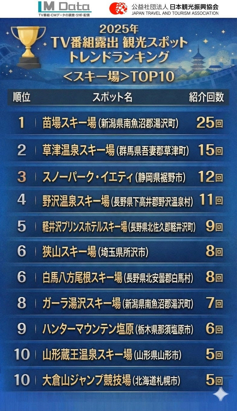スキー場ランキングでは、苗場スキー場(新潟県湯沢町)が25回紹介され、カテゴリ別1位を獲得。2025年に最もテレビ番組で取り上げられたスキー場となった。