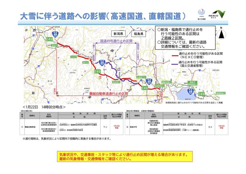 国土交通省とNEXCO東日本は1月24日5時頃から、磐越自動車道・会津若松IC~安田IC間(約71.2キロメートル)と、国道49号の会津坂下IC交差点~三郷チェーン着脱場間(約33キロメートル)で予防的通行止めを行う可能性があると発表した。