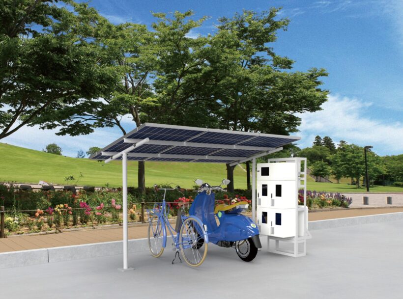 会場では、同社の「ソライユポート」の実機を展示。太陽光パネルを屋根材とし、太陽光発電システムを備えたサイクルポートだ。発電した電力を蓄電池に蓄え、平常時は電動自転車や電動キックボードの給電に利用できる。また、電力網に接続していないので非常用電源としても活用が可能。