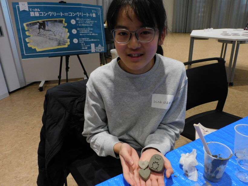参加した長岡市立大島小学校6年の平澤遥香さん(11)は、大人気のアニメキャラクターをかたどったキーホルダーを作り、「意外と簡単な材料で作れた。混ぜて型に詰めるのが楽しかった」と話した。長岡市立黒条小学校4年の桐生咲多郎さん(9)も「楽しかった」と感想を述べ、ワークショップ修了の証として学生たちに手渡された『コンクリート認定証』を大事そうに手にしていた。