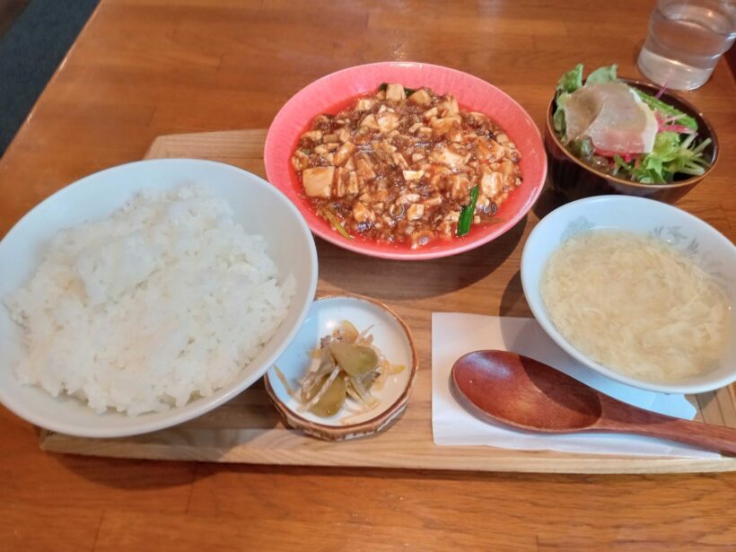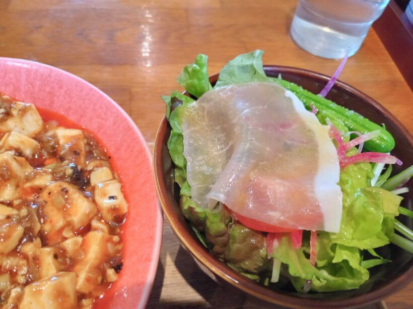 そうこうしているうちに着膳。ほっほー、ビジュいいじゃん。麻婆豆腐が赤黒い妖艶なつやを放つ。ご飯の盛りが良い。サラダに生ハムがオン。この質感で1,200円は好感度高いなあ。