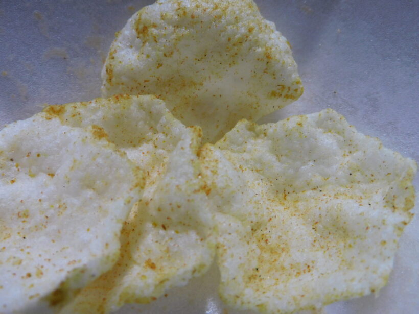 一口目からスパイスが立つ。やさしい味を想像すると少し裏切られるが、辛さで押してくるタイプではない。ウコンパウダーの影響か、ほのかな苦味が感じられる本格派のカレー味だ。スパイスに使用されている「ウコン」は三条市下田地域の生産者によって大切につくられた、鮮やかな黄色みが特長だ。それでも後味は軽く、米粉スナック特有の「サクッ、ふわっ」とした食感で、つい手が伸びる。