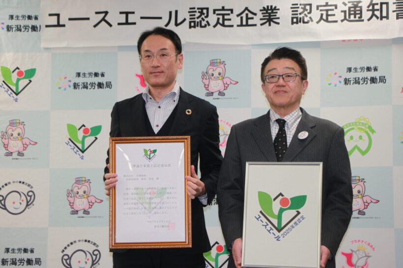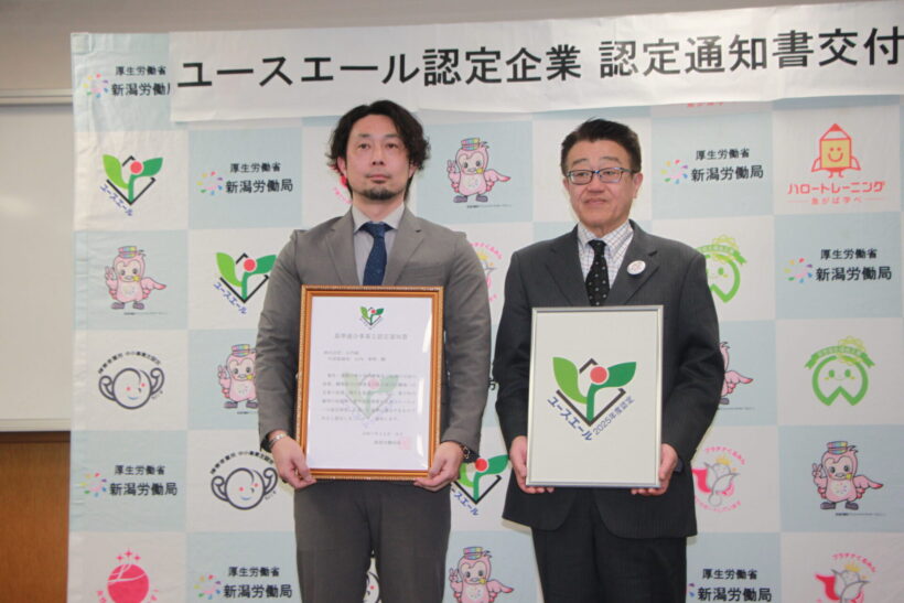厚生労働省新潟労働局はこのほど、株式会社山内組(加茂市)、株式会社野本組(妙高市)、株式会社日建緑地(新潟市江南区)、遠藤商事株式会社(燕市)、株式会社新生技研(新潟市中央区)、株式会社曙建設(長岡市)の6社を、若者の採用や育成などに力を入れるユースエール企業に認定した。