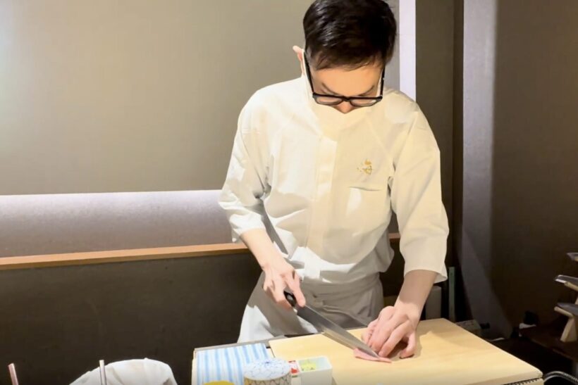 「今日、いいマグロが入ったんです」と話し、丁寧な包丁さばきで寿司を握る近さん