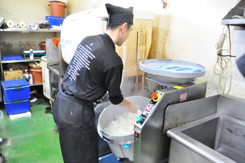ピア万代店で寿司職人として勤務する中島隼人さん、開店前に仕込みをする様子