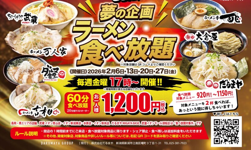 ※長岡・燕エリアの店舗、武蔵イオン青山店、イオン新潟東店・水原店、イオン県央店、だるまやNIIGATA BASE、武蔵イオンモール須坂店は「食べ放題対象外」