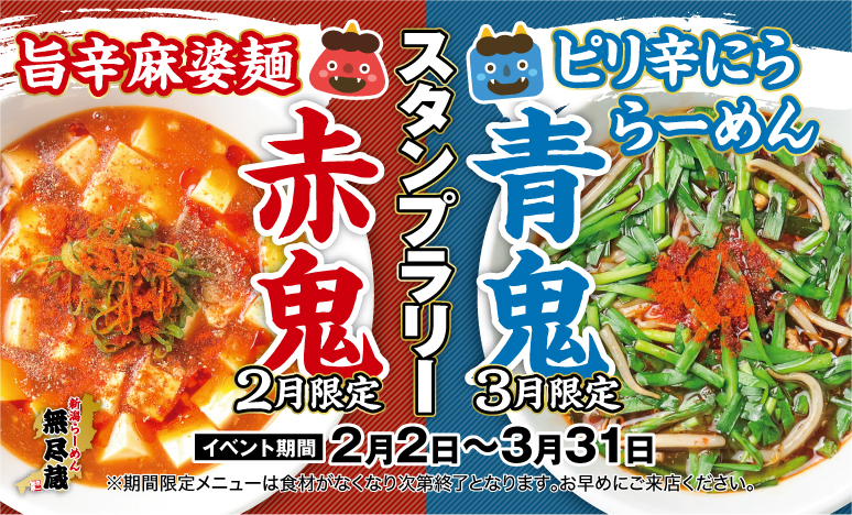 赤鬼をイメージした「旨辛麻婆麺」は2月2日から2月28日まで、青鬼をイメージした「ピリ辛にららーめん」は3月2日から3月31日まで提供する。また期間中、両商品を対象とした「赤鬼青鬼スタンプラリー」を開催。スタンプを集めると、次回以降に使える値引き特典が受けられる。スタンプラリーの対象店舗は、全国20店舗の「新潟らーめん 無尽蔵」。