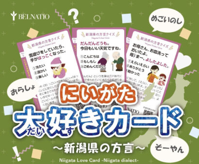 新潟県内で親しまれている「方言」をテーマにしたカード。日常会話の中で自然に使われてきた言葉や、初めて聞くと思わず意味を考えてしまうような、新潟ならではのあたたかく、個性あふれる方言を紹介。「え、そんな意味だったの?!」と会話が広がるきっかけにも。