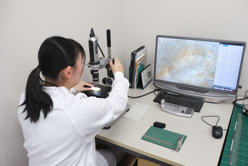 品質の確認のため、マイクロスコープなどの使用は必須だ。庭山さんは大学での経験があったため「そういったところの飲み込みが早く、すぐ戦力になった」と渡辺係長は振り返る(写真はマイクロスコープを使う庭山さん)