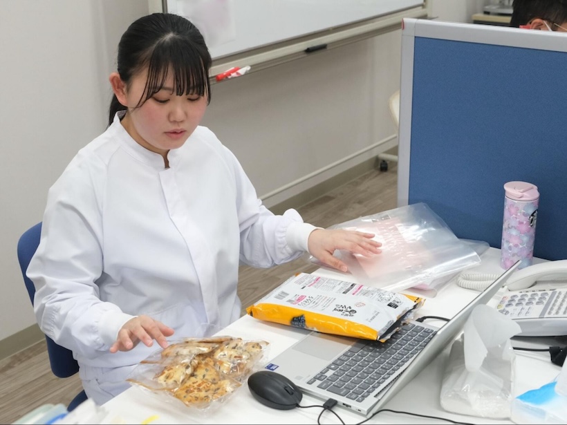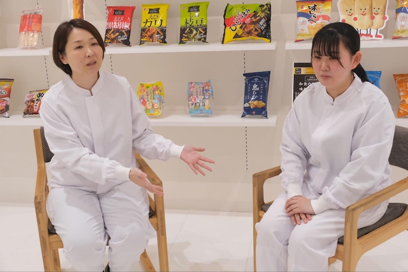 庭山さんは2023年に新潟薬科大学(新潟市秋葉区)応用生命科学部を卒業し、岩塚製菓へ入社。「おかき」や「せんべい」といった日本を代表する菓子を国産米100%で作る同社の、安全と安心を支えている。