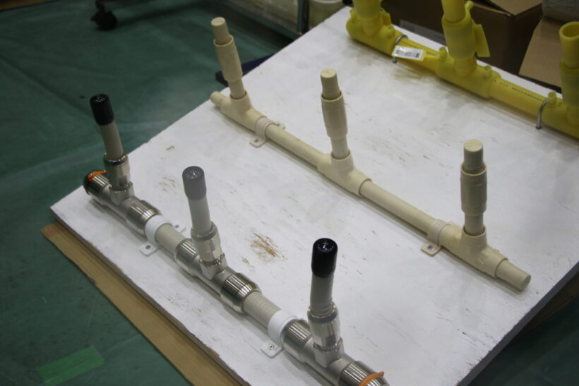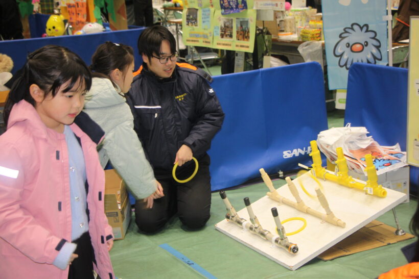 本物のガス管をそのまま利用した越後天然ガスの出展。普段は見慣れない物に触れることで、ガス事業に親しみがわく