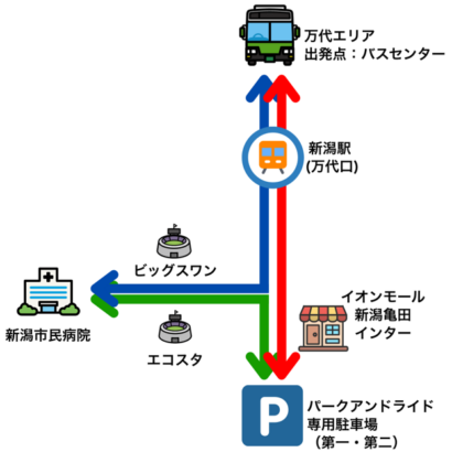 ・シャトルバスで万代シティ、新潟駅、ビッグスワン・エコスタ、新潟市民病院、P&R施設を結ぶ。