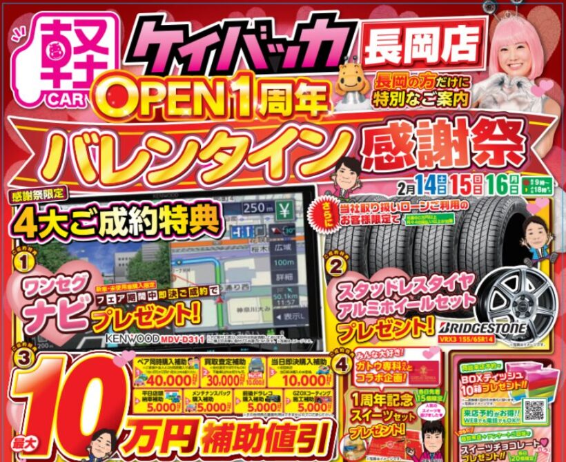 株式会社川内自動車(新潟市秋葉区)は同社が展開する軽未使用車専門店「ケイバッカ長岡店」(長岡市喜多町)がオープン1周年を迎えるにあたり「ケイバッカ長岡店オープン1周年記念バレンタイン感謝祭」を開催する。