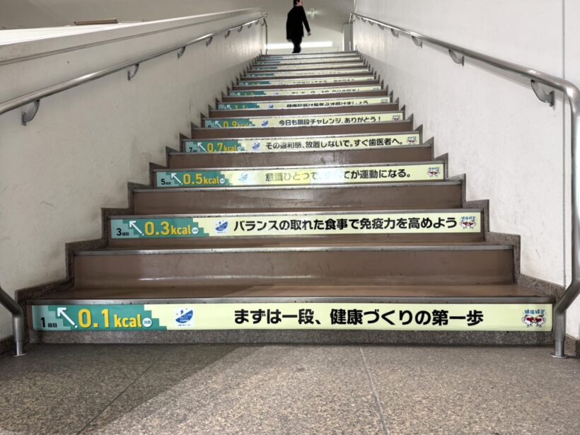 高舘組では階段に消費カロリーを書いて階段の使用を啓発する取り組みも実施。県庁でもこれを取り入れ、階段に消費カロリーと健康標語を書いたステッカーを貼っている(写真は新潟県庁)